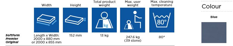 The Softform Premier Original Mattress is a Very high risk foam mattress . User weight of up to 39 stone. Standard size 200cm x 85.5cm x 15cm (other sizes available on request), Ideal mattress for patient comfort and pressure care.